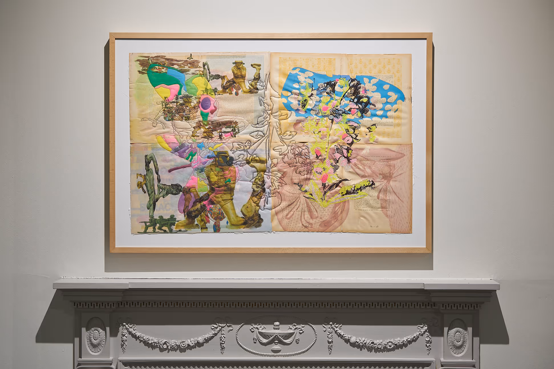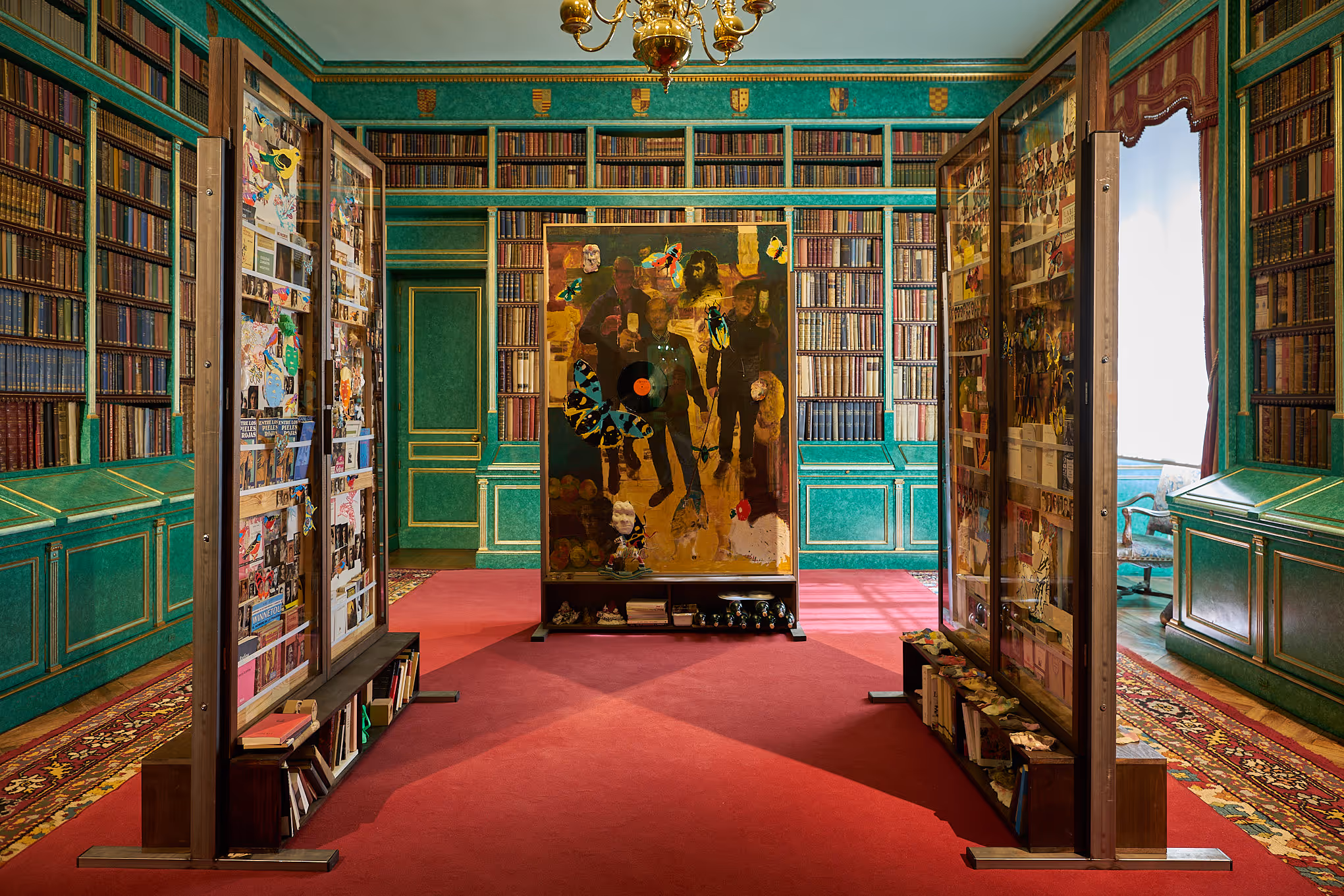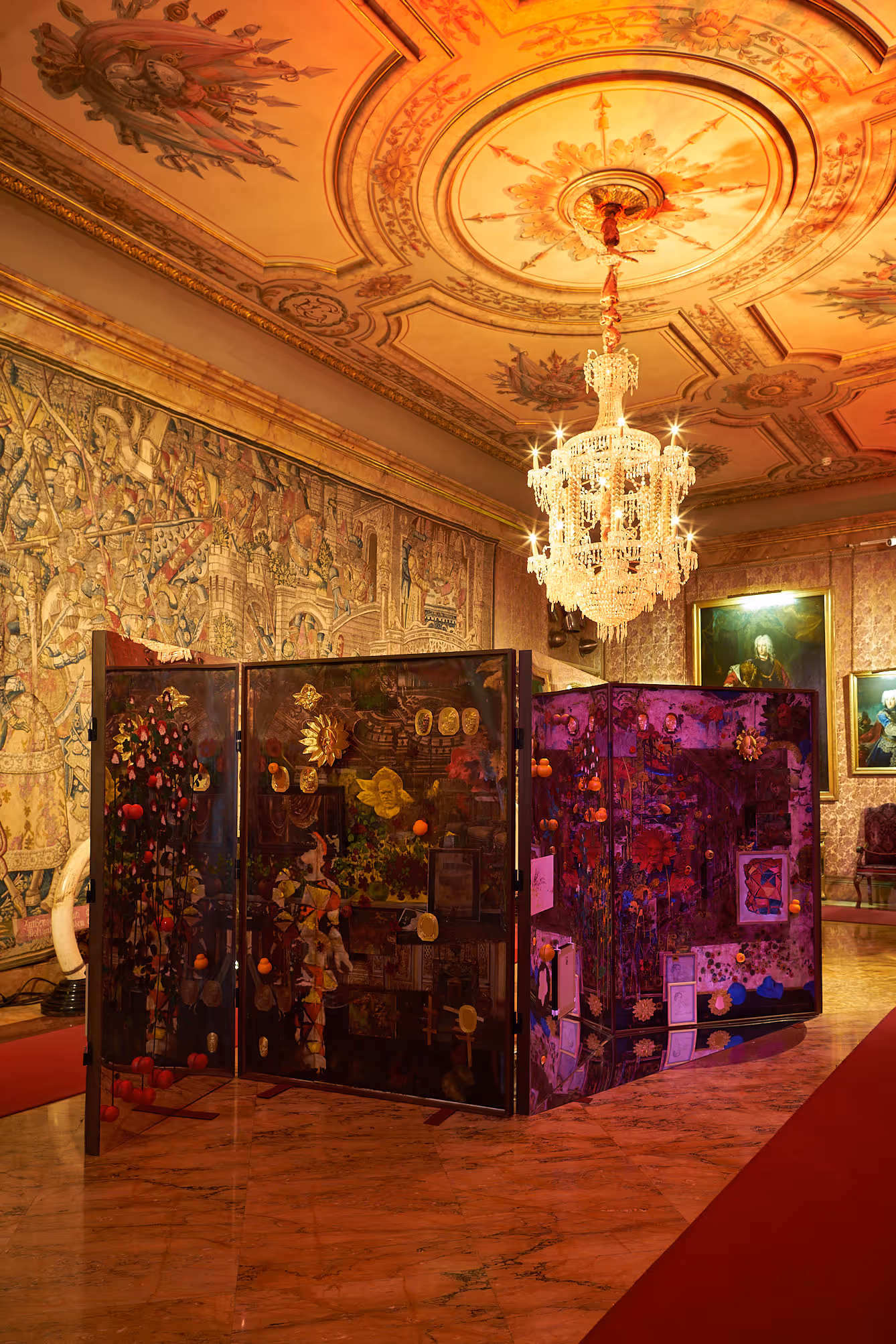 La muestra reúne una veintena de obras, entre las que se encuentran creaciones recientes del artista junto a piezas procedentes de etapas anteriores, trazando una visión amplia de su práctica en las últimas décadas. En su conjunto, estas obras activan un campo de resonancias entre la biografía del artista, la memoria del palacio y la experiencia del visitante.